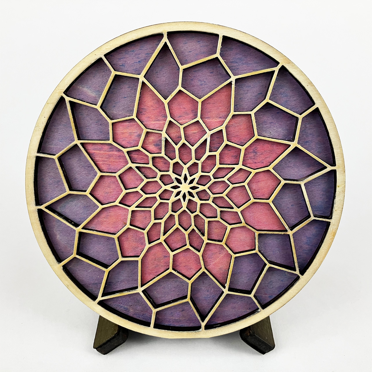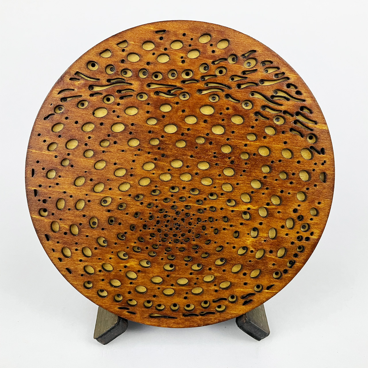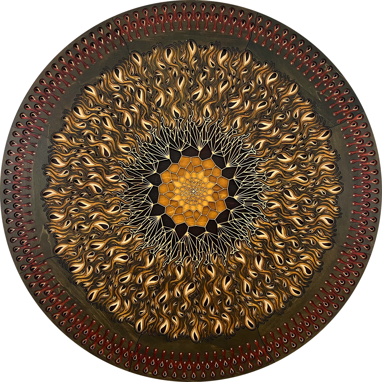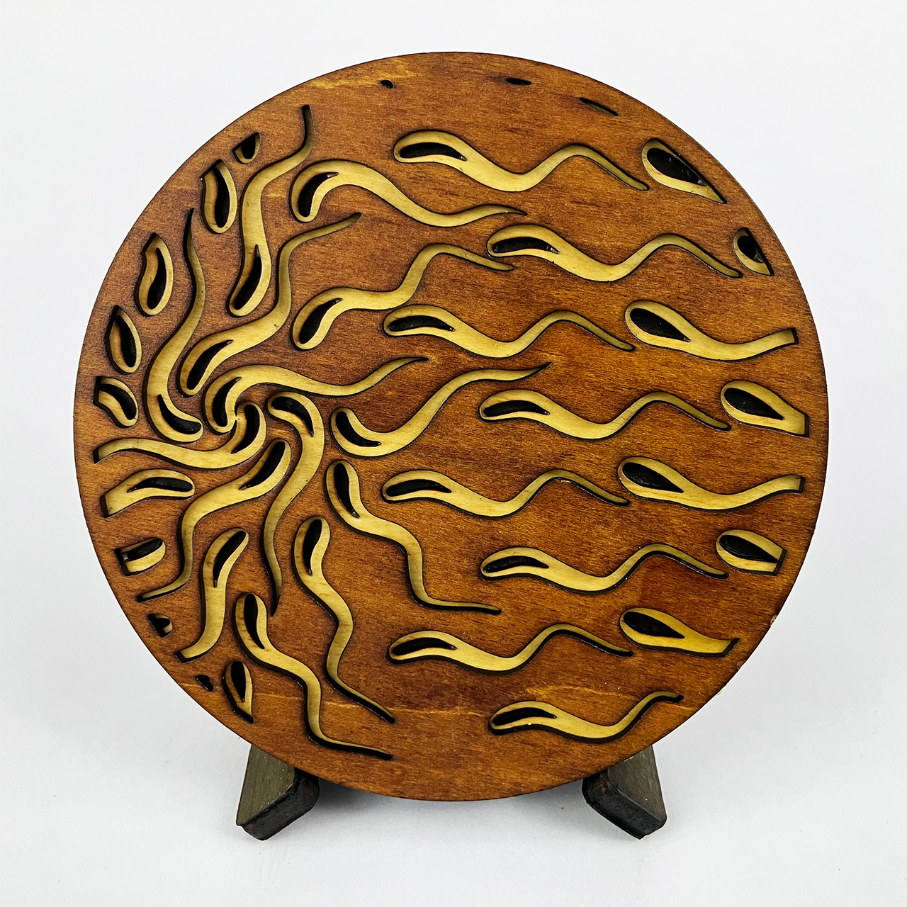 This piece is based on the painting I finished in September 2021 called Light at the End of the Tunnel (LATEOTT). It consists of 75 individual pieces of laser cut wood, stained then assembled with glue. Once again, I went from pencil sketch to painting to computer design to laser cut wood.