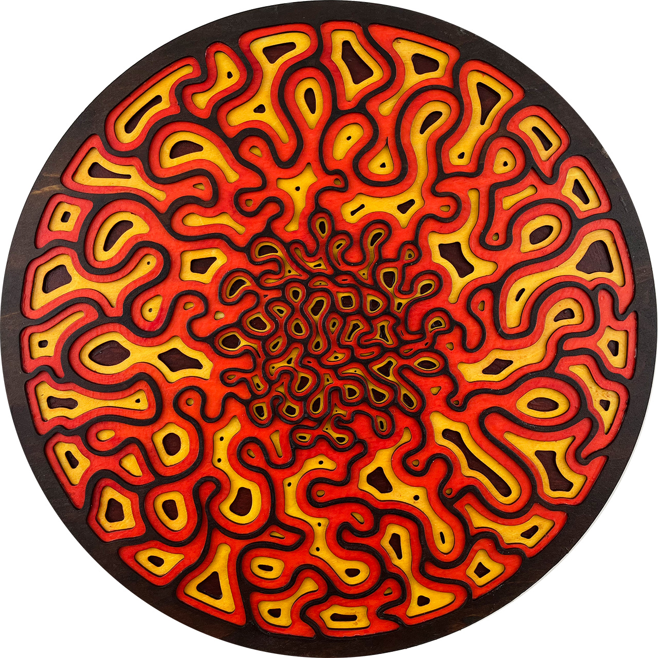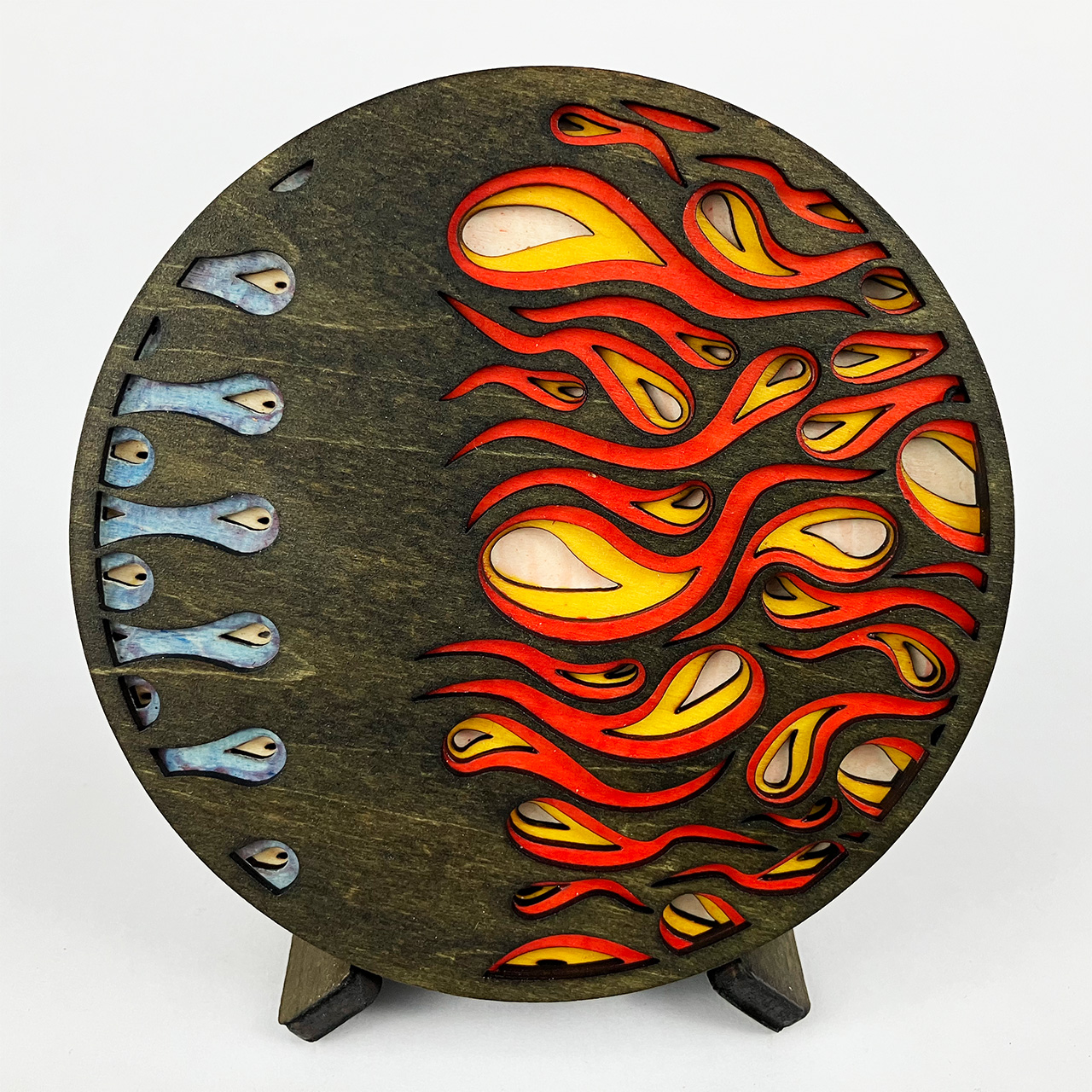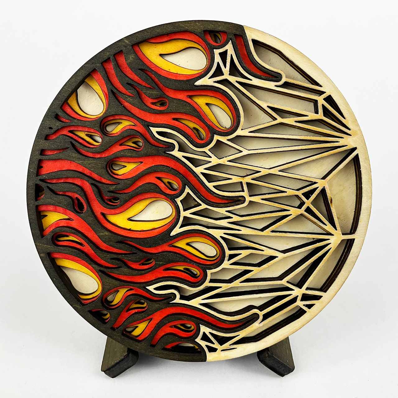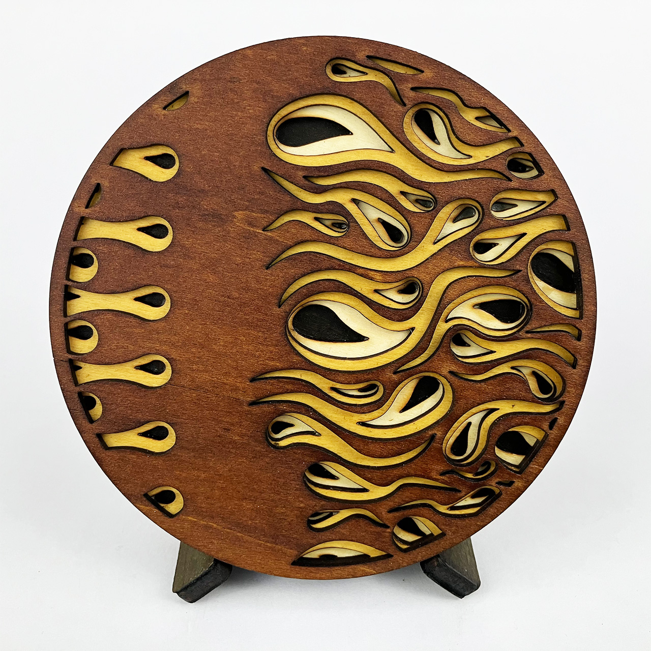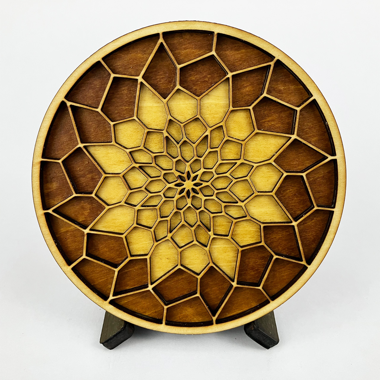 This piece is based on the painting I finished in September 2021 called Light at the End of the Tunnel (LATEOTT). It consists of 75 individual pieces of laser cut wood, stained then assembled with glue. Once again, I went from pencil sketch to painting to computer design to laser cut wood.