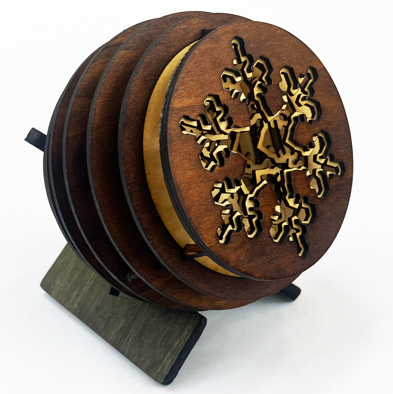 Snowflake Ornament Angle View | 3.6" x 3.6" x 2.5" | Laser Cut Wood