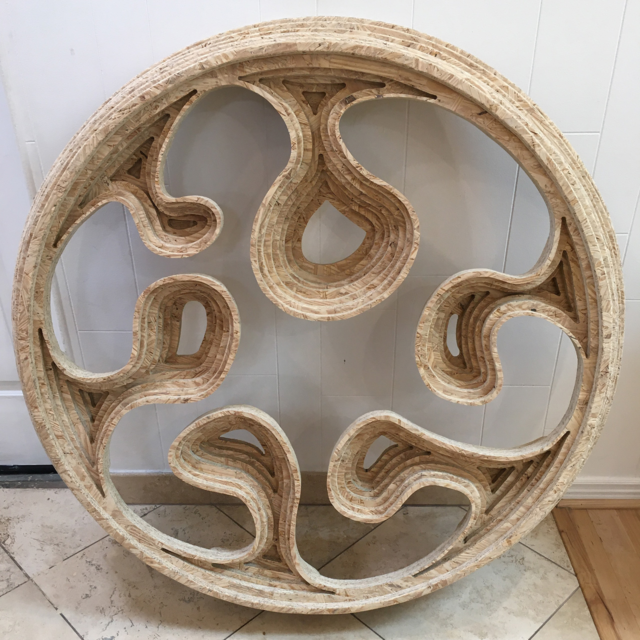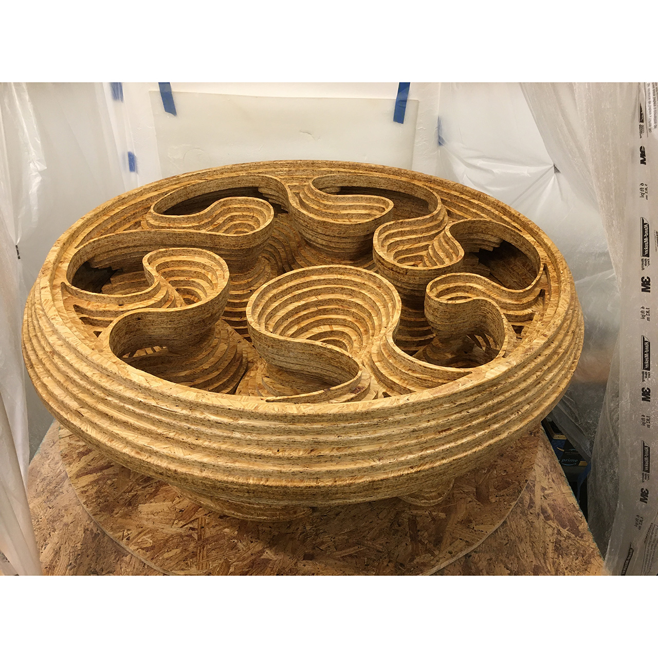 I designed this table in 2D using Illustrator, then built scale model from laser cut wood (first image above). I cut out the feet with the new CNC router. It didn't go well - the router kept jumping out of the track destroying the piece it was cutting. I tried many different feed rates and router speeds. In the end, I decided to race the CNC with my jigsaw. I built a fixture to hold a permanent marker (instead of the router), and used the CNC as a plotter to draw the components on 4' x 8' plywood. Cutting with the jigsaw was substantially faster, quieter, and less dusty that the CNC. So in the end, I cut all but the feet with the jigsaw. This was followed by endless days of sanding, routing corners, and finally assembly with screws and glue. I finished it with 17 coats of clear acrylic finish so it will stand up to the wear of feet resting against it. See March 2023 for views the final piece.