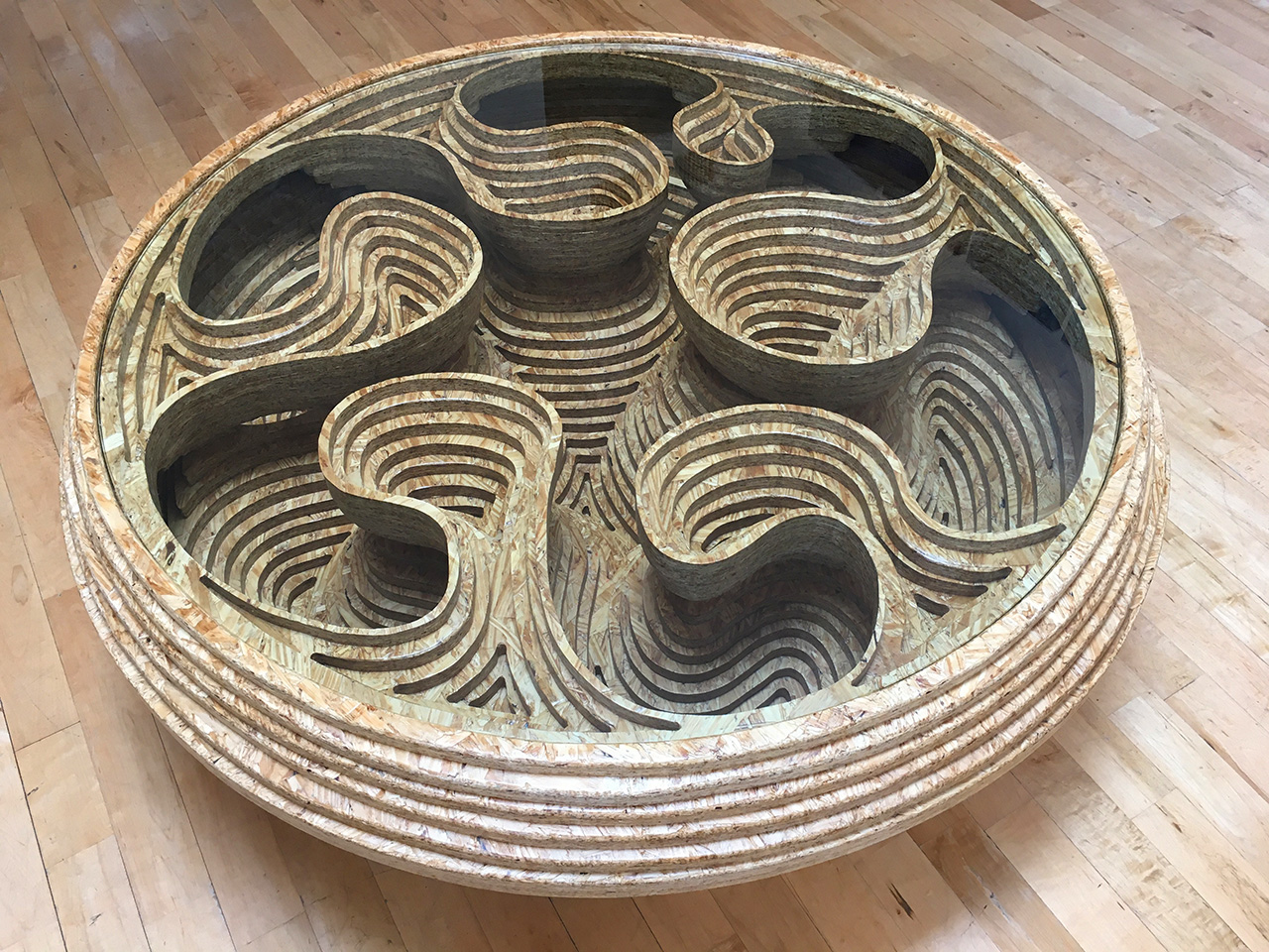 This piece was inspired by Antelope Canyon near Page Arizona. It is intended to function as an ottoman as much as a table with feet resting against the ribbed bevel. To see how it was made, see February 2023.