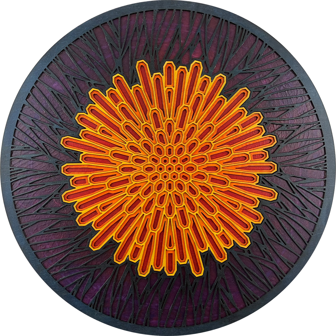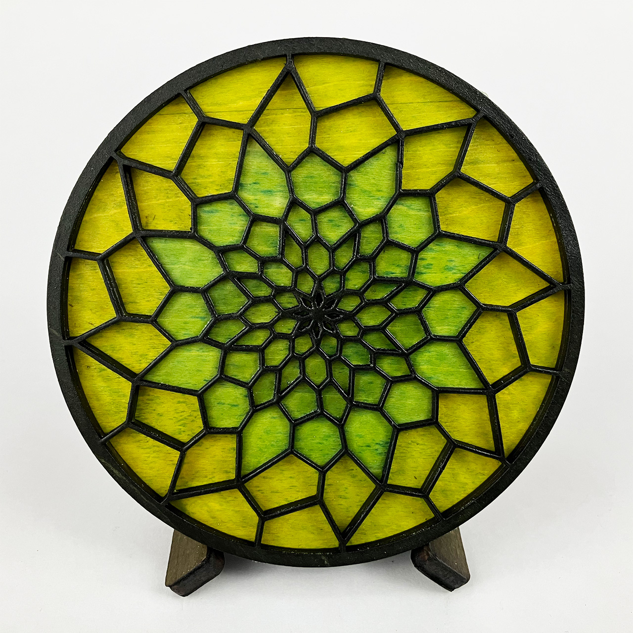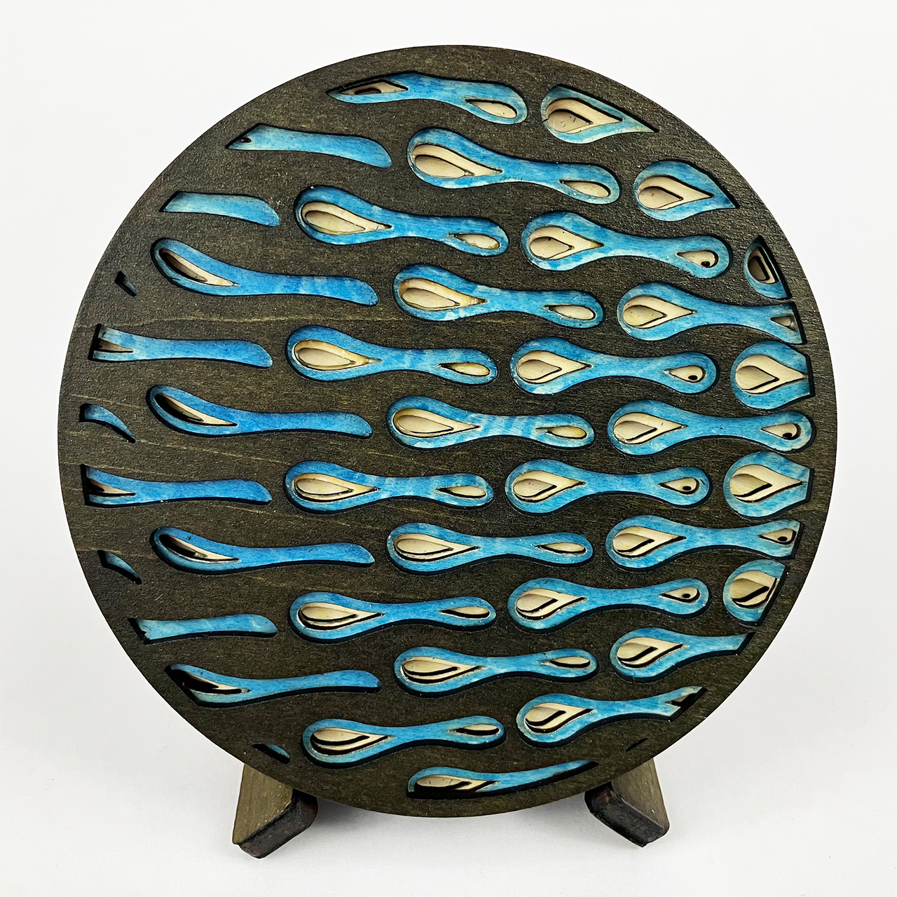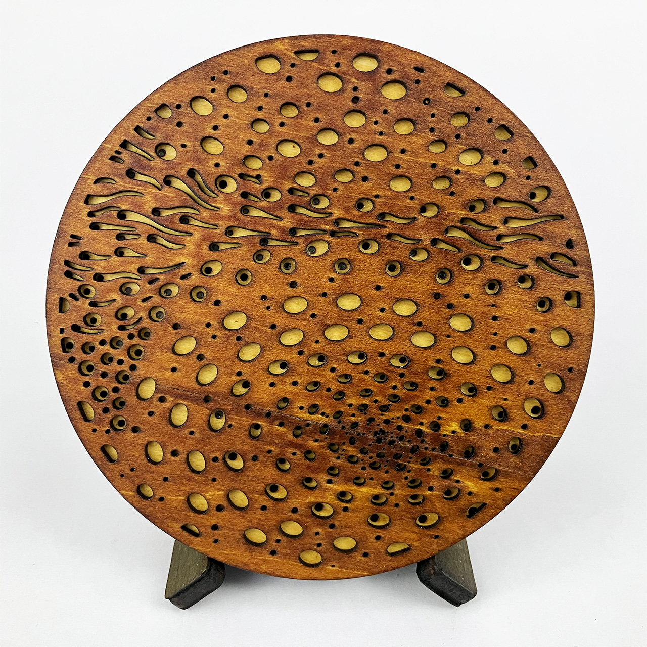 This piece is based on the painting I finished in September 2021 called Light at the End of the Tunnel (LATEOTT). It consists of 75 individual pieces of laser cut wood, stained then assembled with glue. Once again, I went from pencil sketch to painting to computer design to laser cut wood.